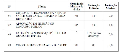 A segunda etapa do concurso será aplicada para os candidatos que obtiveram pontuação igual ou superior a 50 % (cinqüenta por cento), na Prova Objetiva, a Provas de Títulos a ser pontuada de acordo com a Tabela abaixo.