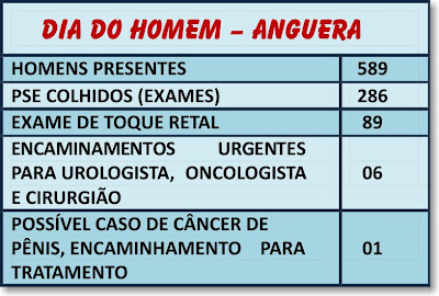ESTATÍSTICA DO DIA DO HOMEM A Secretaria Municipal de Saúde divulgou a estatística de presença e procedimentos registrados durante a mobilização em homenagem ao Dia do Homem. Confira os dados na tabela abaixo: