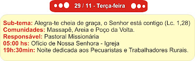 O Novenário em Louvor a Nossa Senhora da Conceição, Padroeira de Anguera, começa nesta terça-feira (29/11). O Tema deste ano é: Com Maria nos Caminhos de Jesus.