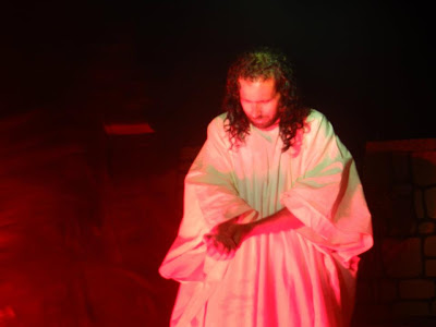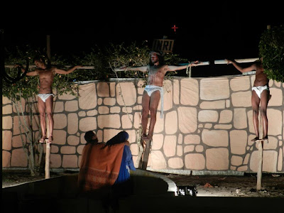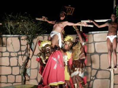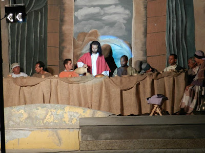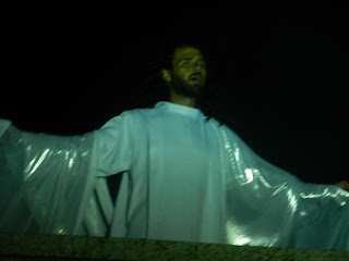 SENSACIONAL ESSA É A PALAVRA CORRETA A emoção tomou conta do grande público que compareceu à Praça Arthur Vieira para assistir a apresentação da PAIXÃO E MORTE DE CRISTO com o Grupo de Teatro RENASCER, na noite de Sexta-Feira da Paixão (06 de abril). Em cena, noventa artistas dirigidos por Fábio Bitencurt, provocaram emoção em momentos especiais como “A Santa Ceia”, a “Negação de Pedro a Jesus”, a “Traição de Judas”, “Crucificação de Cristo”, a “Morte” e “Ressurreição”. Um momento surpresa, considerado de maior emoção pelo público, foi a aparição de Cristo Ressuscitado, com os braços abertos, no alto do quiosque em construção, ponto da Praça Arthur Vieira muito bem aproveitado para compor o cenário. Neste instante o céu de Anguera foi tomado por fogos de artifícios com chamas de diversas cores, enquanto pessoas silenciavam, choravam, emocionavam, fotografavam, olhavam para o alto e se confraternizavam. CENÁRIO Desde o início da manhã uma equipe formada por 20 contra-regras organizavam o cenário. Cada recanto da Praça Arthur Vieira, no calçadão em frente ao Mercado Municipal ganhou forma adequada, chamando atenção dos populares. Ao final da tarde, completamente arrumado, o cenário era de grande beleza, fazendo a Praça de Anguera lembrar Jerusalém, a Terra Santa. A apresentação da “Paixão e Morte de Cristo” foi uma ação da Prefeitura Municipal junto ao Grupo de Teatro RENASCER, sendo o Departamento de Cultura responsável pela logística. As imagens que ilustram essa reportagem foram colhidas pelas lentes fotográficas de Rogério Brito, que entrou no cenário caracterizado como artista, para registrar na História de Anguera este momento único e especial, vivenciado na Praça da Cidade, um chão que agora, mais que nunca, é o “Chão da Liberdade”, da ressureição, de uma cidade renovada, do amor, da paz e da fraternidade. O teatro chegou aos olhos das famílias anguerenses, assim como no Natal, também na Semana Santa, marcando ANGUERA, a antiga Fazenda Almas, como “Terra da Liberdade”. Ontem (Sexta-Feira da Paixão) o povo estava emocionado, porém FELIZ! No Facebook e Orkut do Anguera Online você confere todas as fotos. Texto: Márcio Vasconcelos