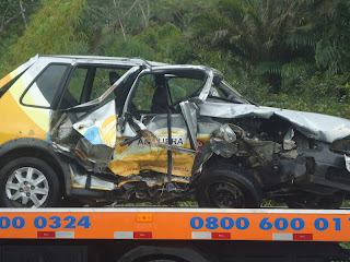 Por volta das 8 horas dessa quinta (17/05/2012), o Uno da Assistência Social da Prefeitura Municipal de Anguera foi fechado na Rodovia BR 324 por uma carreta quando fazia ultrapassagem. O Uno conduzido pelo experiente motorista Gildo, perdeu o controle do veiculo saindo da pista e indo descontrolado para a pista contraria sendo atingido do lado do passageiro por outro veículo. Alem do motorista Gildo, ocupava o veiculo as assistentes social Nelcy, que recebeu toda pancada do veiculo contrario e Marília Gomes. De imediato Gildo e Marília foram socorridos pela equipe do Samu sendo levados para hospitais da região. Gildo teve uma forte pancada no estomago foi medicado e liberado. Marília Gomes teve fratura em uma das pernas e também foi liberada. Nelcy que ficou presa nas ferragens deu muito trabalho para a equipe do SAMU. Após ser retirada, a assistente social Nelcy de Jesus