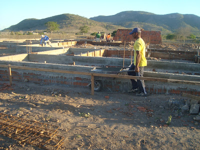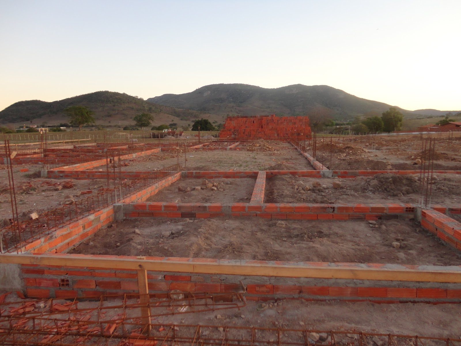 Foi feita a terraplanagem e erguido todo alicerce. Os trabalhadores estão começando a levantar as paredes.