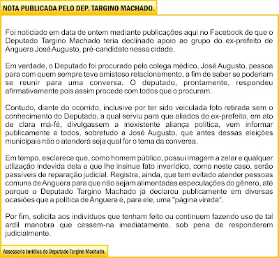À noite, no FACEBOOK de Vanderlon Cunha, pré-candidato a vereador em Anguera, foi anunciada a suposta adesão do Deputado Targino Machado ao grupo político do ex-prefeito José Augusto. Confira abaixo: