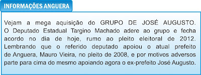 Típico de ano eleitoral, os bastidores políticos estão agitados em Anguera. No dia de ontem (sexta-feira, 25/05), um encontro “casual” do ex-prefeito José Augusto e o Deputado Targino Machado, ganhou destaque no facebook, com requinte apimentado, comemorações, e por fim, desencontros e inveracidades.