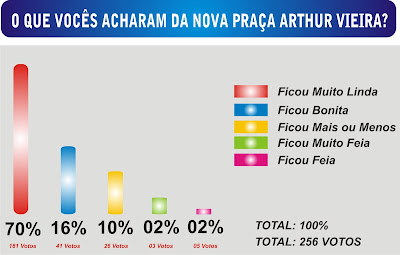 Como já esperado, 181 (70%) internautas disseram que a Praça Arthur Vieira está Linda. Os que acharam que a Praça Ficou Bonita somaram 41 votos (16%). Um pouco menos, votaram dizendo que a Praça está Mais ou Menos, somando assim 26 votos (10%). Na votação, ainda apareceram a minoria, que disseram que a praça estava Feia, com 3 votos (02%) e Muito Feia com 5 votos (02%).