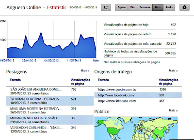 O BLOG ANGUERA ONLINE completou no inicio desta manha de domingo 19 de maio, a marca de 500 mil acessos desde a sua criação 29 de julho de 2008 com media de 100 mil acessos por ano. Diariamente o ANGUERA ONLINE é visitado por 1.200 pessoas do município, também a nível nacional e internacional.