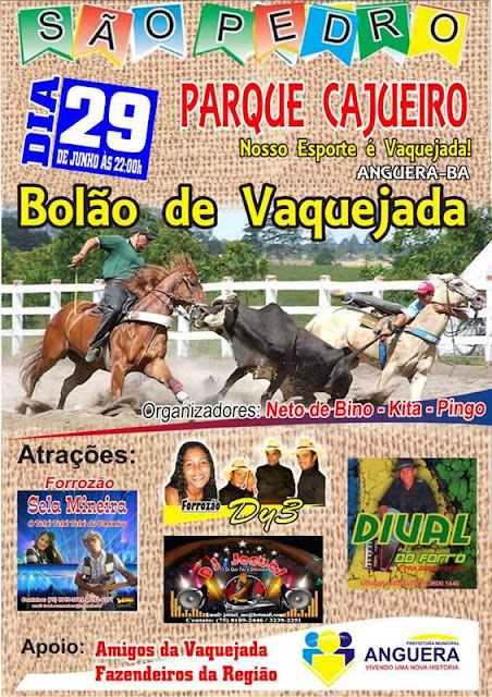 Não fique de fora do Bolão de Vaquejada que será realizado no dia 29 de Junho (São Pedro) no Parque Cajueiro, sendo animado pelas Bandas Forrozão DY3, Forrozão Sela Mineira, Dival do Forró e Boate com Dj Josuel.