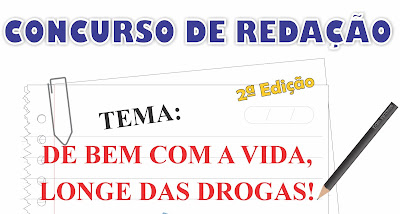 Foi aberta ontem as inscrições do CONCURSO DE REDAÇÃO, cujo tema é: De bem com a vida, longe das Drogas.