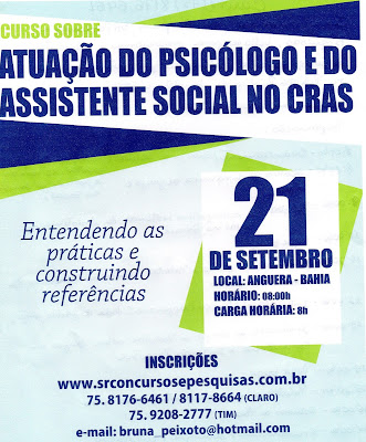 Será realizado no dia 21 de setembro, das 08 às 17 horas, na cidade de ANGUERA, um curso sobre ATUAÇÃO DO PSICÓLOGO E DO ASSISTENTE SOCIAL NO CRAS, promovido pela empresa RS CONCURSOS E PESQUISAS.