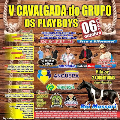 A Cavalgada do Grupo Os playboys acontecerá no dia 06 de Outubro, com percurso saindo de Anguera e passando por Roma, Buraco D’Água, Cabeça do Boi, Barra e chegando na Fazenda Soledade (Moisés Couto).
