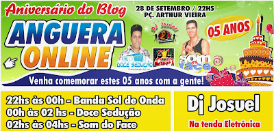 PROGRAMAÇÃO DA FESTA DE ANIVERSÁRIO DO BLOG ANGUERA ONLINE Confira abaixo a programação da festa em comemoração aos 05 anos do Blog Anguera Online.